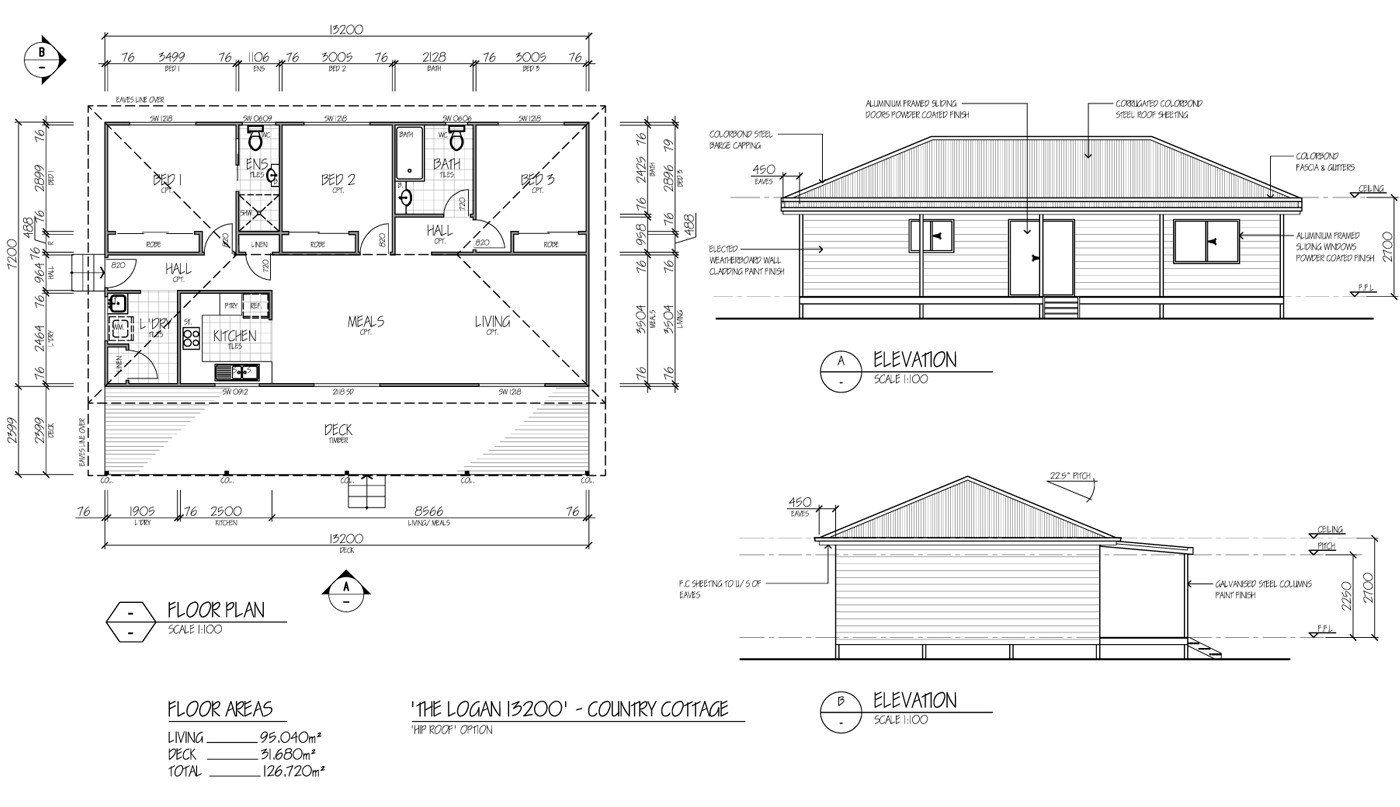 Engineer designed Steel House Framing System. Galvanised high tensile steel materials. Factory fabricated house frame panels for external and internal walls (studs at nominal 600mm centres). Steel roof trusses fabricated at standard 20 degree pitch (1.2 m centres). Steel roof battens. Steel ceiling battens. Bluescope Colorbond roof sheeting (full colour range available). Colorbond raingoods (gutters,capping and flashings). Colorbond horizontal external wall cladding. Sliding glass door and windows (as per floor plans). All windows supplied with aluminium frames and timber reveals (to suit internal lining). Hardware to erect basic kit. Gable roof style standard (dutch gable & hip roof styles optional extras). Supplied to Class 1 habitable standard. Standard engineers plans supplied. Kit to W41N (N3) windload (Cyclonic upgrades available if required). 450mm Eaves to sides |